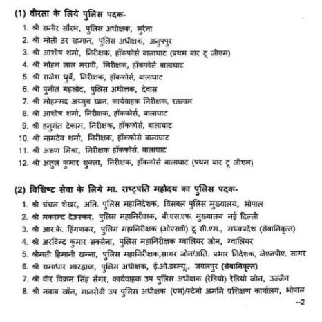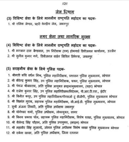 स्वतंत्रता दिवस 15 अगस्त के अवसर पर मध्यप्रदेश पुलिस विभाग के कई अधिकारियों-कर्मचारियों को विभिन्न श्रेणियों में पदकों से सम्मानित किया जाएगा। जिनमें पुलिस वीरता पदक, पुलिस विशिष्ट सेवा पदक, जेल विभाग विशिष्ट पदक, होमगार्ड विशिष्ट पदक, पुलिस सराहनीय सेवा पदक, विशेष सराहनीय सेवा पदक, होमगार्ड सराहनीय सेवा पदक और जीवन रक्षा पदक शामिल हैं।