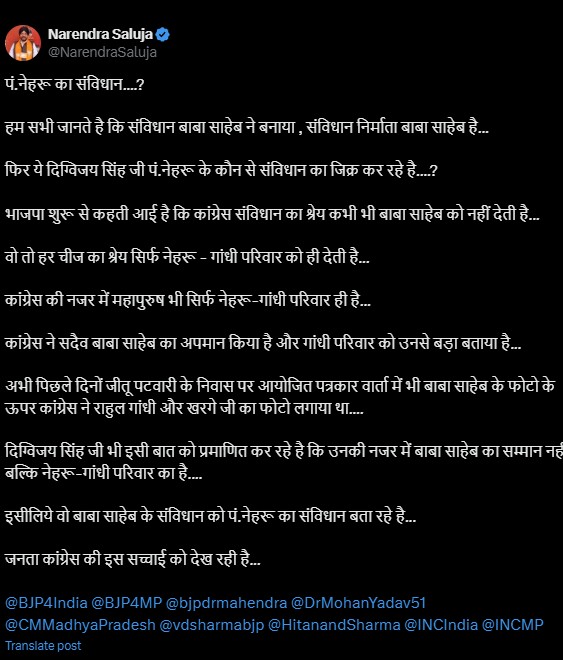 बीजेपी प्रदेश प्रवक्ता नरेंद्र सलूजा ने सोशल मीडिया एक्स पर पोस्ट कर दिग्विजय सिंह पर निशाना साधा। उन्होंने लिखा, “पं.नेहरू का संविधान…? हम सभी जानते है कि संविधान बाबा साहेब ने बनाया। संविधान निर्माता बाबा साहेब हैं। फिर ये दिग्विजय सिंह जी पं.नेहरू के कौन से संविधान का जिक्र कर रहे है?