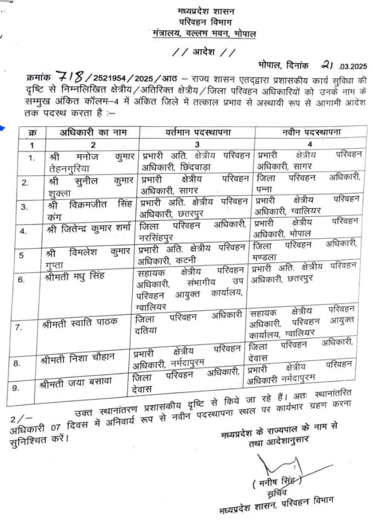 जारी आदेश में भोपाल का प्रभारी आरटीओ जितेंद्र कुमार शर्मा और ग्वालियर का प्रभारी क्षेत्रीय परिवहन अधिकारी विक्रमजीत सिंह कंग को बनाया गया है। इसके अलावा भोपाल, ग्वालियर, सागर, नर्मदापुरम, छतरपुर, देवास और अन्य जिलों में परिवहन अधिकारियों की नई नियुक्तियां की गईं।