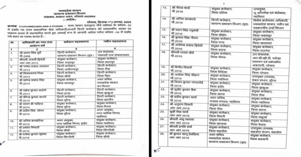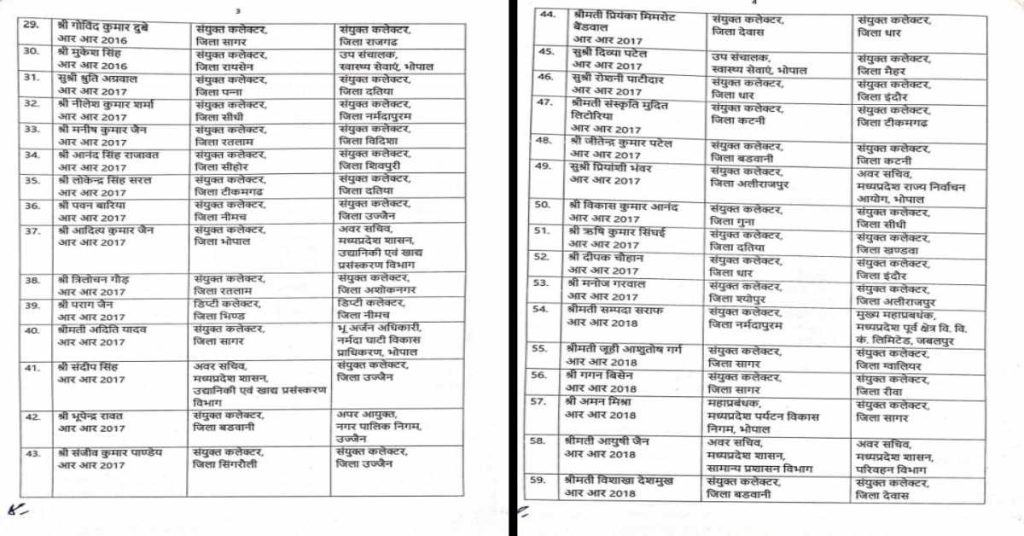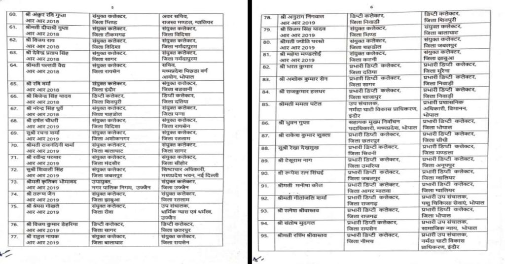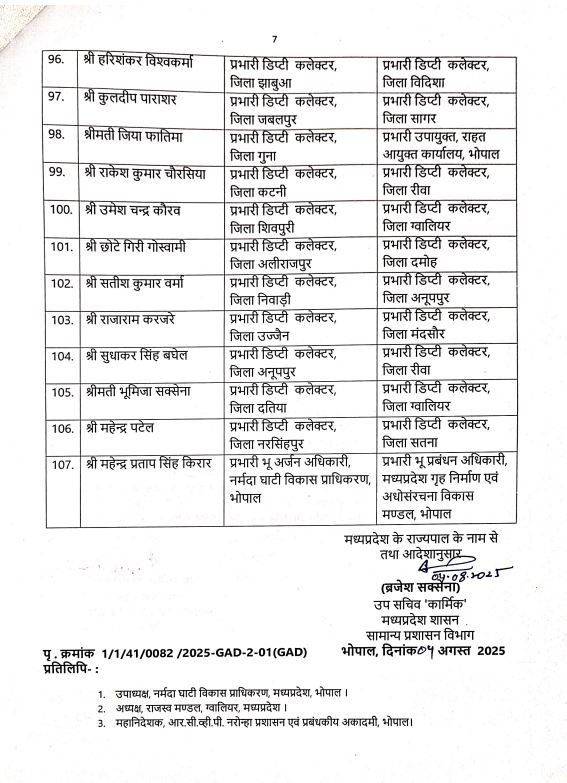 शिखिल ब्यौहार, भोपाल। मध्य प्रदेश में राज्य प्रशासनिक सेवा अधिकारियों और प्रभारी डिप्टी कलेक्टरों का थोक में तबादला किया गया है। इस संबंध में सामान्य प्रशासन विभाग ने आदेश जारी कर दिया है। जारी आदेश के मुताबिक, कुल 107 अफसरों को इधर से उधर किया गया है। यहां देखिए पूरी सूची…