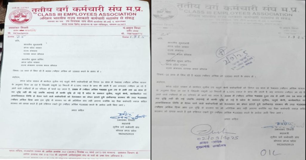 तृतीय वर्ग कर्मचारी संघ के महामंत्री उमाशंकर तिवारी ने जानकारी में बताया कि मध्य प्रदेश शासन में कार्यरत तृतीय-चतुर्थ श्रेणी कर्मचारियों को बीते 16 साल से 4000 रुपये त्योहार अग्रिम दिया जा रहा है, जिसकी वसूली 10 किस्तों में 6.50% ब्याज के साथ की जाती है। अब लगातार त्योहार आ रहे हैं, आने वाले फेस्टिवलों में हर परिवार में खर्चा बढ़ जाता है।