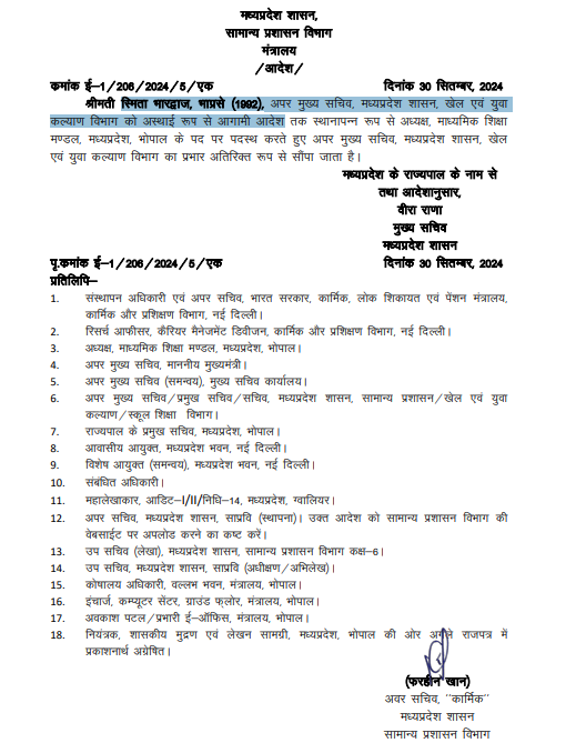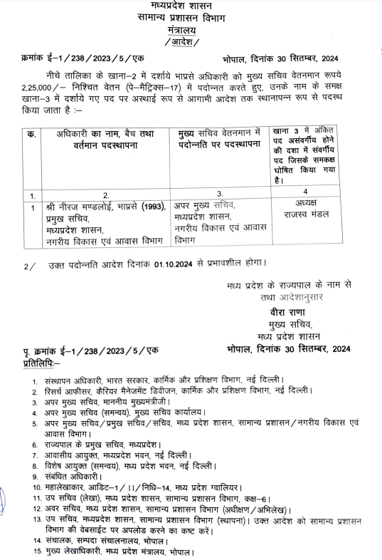 वहीं वीरा राणा के रिटायरमेंट के साथ ही 1993 बैच के आईएएस नीरज मंडलोई प्रमोट हो गए। उन्हें राजस्व बोर्ड के अध्यक्ष की कमान सौंपी गई है। इस संबंध में आदेश भी जारी कर दिया गया है। इधर, खेल एवं युवा कल्याण विभाग की अपर मुख्य सचिव स्मिता भारद्वाज को माध्यमिक शिक्षा मंडल का अध्यक्ष बनाया गया है। स्मिता के पास खेल एवं युवा कल्याण विभाग का अतिरिक्त प्रभार भी रहेगा। यहा देंखे आदेश की कॉपी…