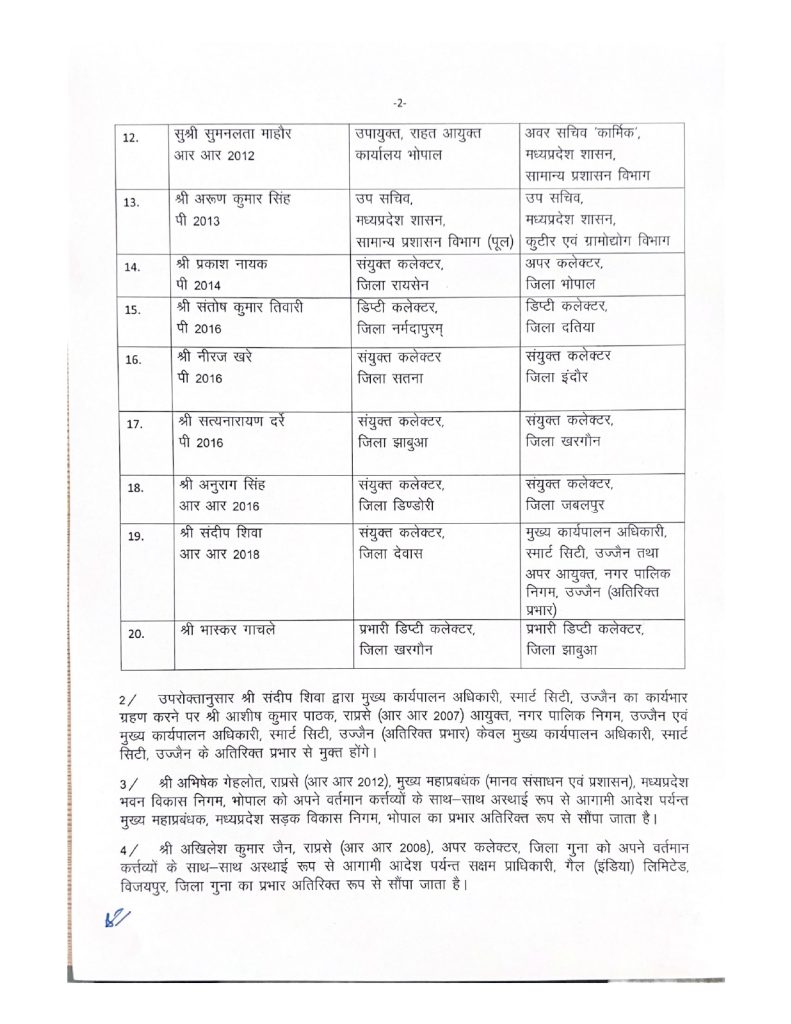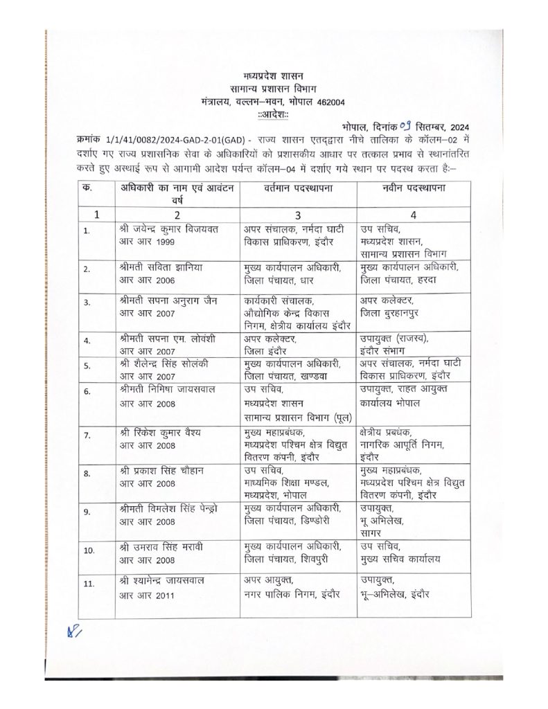 आदेश के अनुसार, इंदौर नर्मदा घाटी विकास प्राधिकरण, धार जिला पंचायत के सीईओ समेत कई अधिकारियों को नई जिम्मेदारी दी गई है।