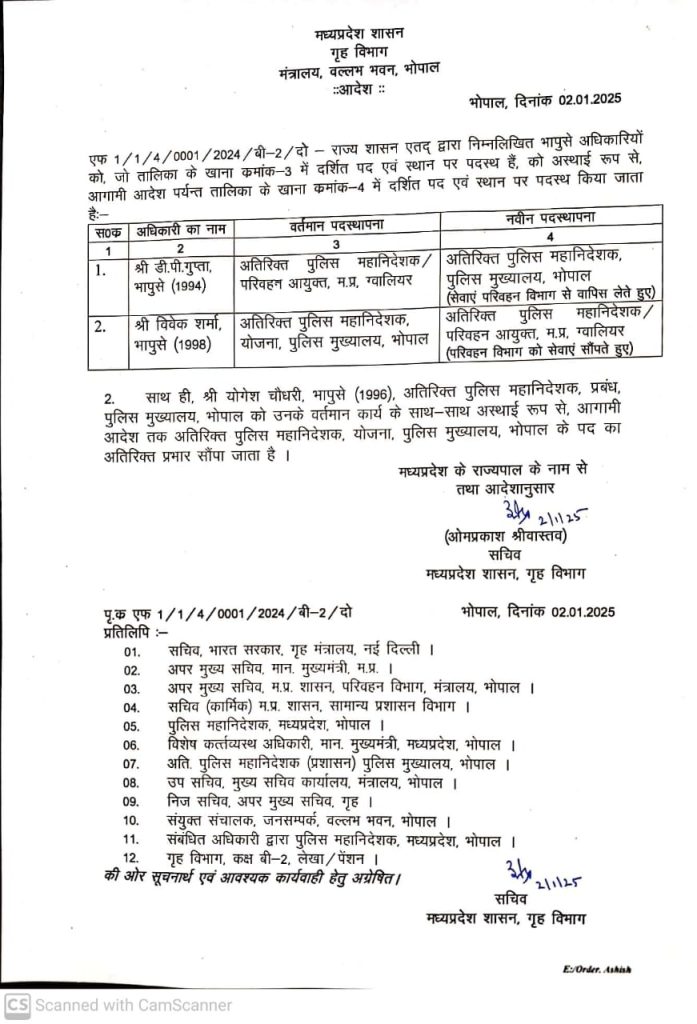 शब्बीर अहमद, भोपाल। मध्य प्रदेश में लोकायुक्त की छापेमार कार्रवाई और विवादों के बीच परिवहन विभाग में बड़ा फेरबदल किया गया है। परिवहन आयुक्त डीपी गुप्ता को हटाया गया है। ADG विवेक शर्मा को मध्य प्रदेश का नया परिवहन आयुक्त बनाया गया है। वहीं अब तक परिवहन आयुक्त रहे डीपी गुप्ता को वापस पुलिस मुख्यालय भेजा गया है। इस संबंध में राज्य सरकार ने आदेश जारी किया है।