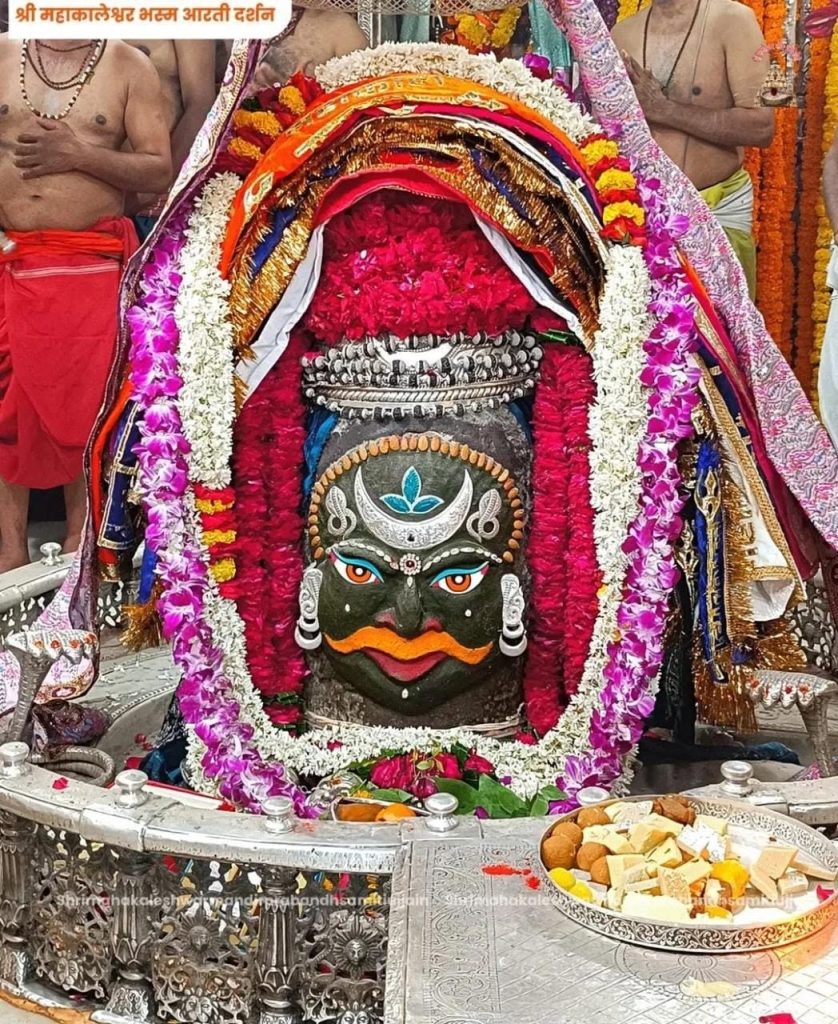 बुधवार को भगवान महाकाल का त्रिपुंड चंद्र और त्रिनेत्र अर्पित कर दिव्य श्रृंगार किया गया। श्री महाकालेश्वर को भस्म चढ़ाई गई। साथ ही शेषनाग का रजत मुकुट, रजत की मुण्डमाल, रुद्राक्ष की माला के साथ सुगंधित पुष्प से बनी फूलों की माला धारण की। बाबा को फल और मिष्ठान का भोग लगाया गया। भोले बाबा का ड्रायफ्रूट से आकर्षक श्रृंगार किया गया।