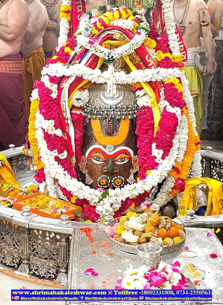 शनिवार को भगवान महाकाल का भांग चंदन और आभूषणों से हनुमान स्वरूप में श्रृंगार किया गया। श्री महाकालेश्वर को भस्म चढ़ाई गई। साथ ही शेषनाग का रजत मुकुट, रजत की मुण्डमाल, रुद्राक्ष की माला के साथ सुगंधित पुष्प से बनी फूलों की माला धारण की। बाबा को फल और मिष्ठान का भोग लगाया गया। भोले बाबा का ड्रायफ्रूट से आकर्षक श्रृंगार किया गया।