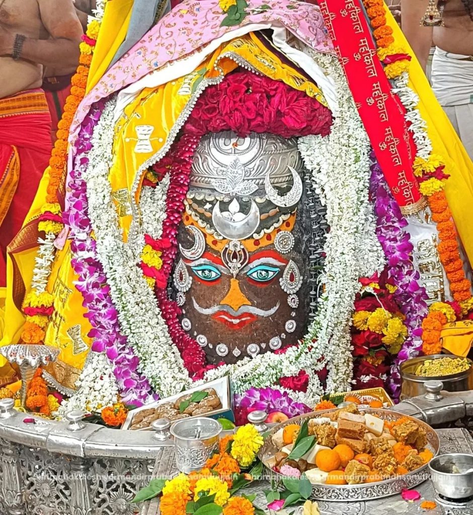 शुक्रवार को भगवान महाकाल के मस्तक पर बेलपत्र और चंद्र अर्पित कर दिव्य श्रृंगार किया गया। श्री महाकालेश्वर को भस्म चढ़ाई गई। साथ ही शेषनाग का रजत मुकुट, रजत की मुण्डमाल, रुद्राक्ष की माला के साथ सुगंधित पुष्प से बनी फूलों की माला धारण की। बाबा को फल और मिष्ठान का भोग लगाया गया। भोले बाबा का ड्रायफ्रूट से आकर्षक श्रृंगार किया गया।
