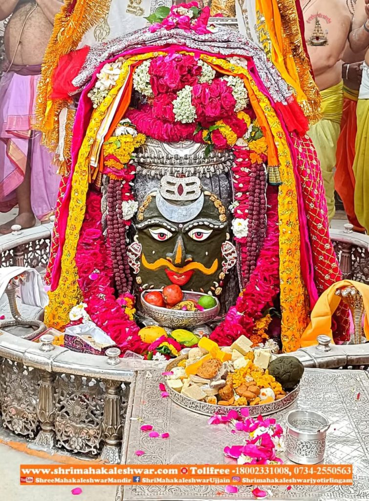 बुधवार को भगवान महाकाल का भांग चंदन और आभूषणों से श्रृंगार किया गया। श्री महाकालेश्वर को भस्म चढ़ाई गई। साथ ही शेषनाग का रजत मुकुट, रजत की मुण्डमाल, रुद्राक्ष की माला के साथ सुगंधित पुष्प से बनी फूलों की माला धारण की। बाबा को फल और मिष्ठान का भोग लगाया गया। भोले बाबा का ड्रायफ्रूट से आकर्षक श्रृंगार किया गया।