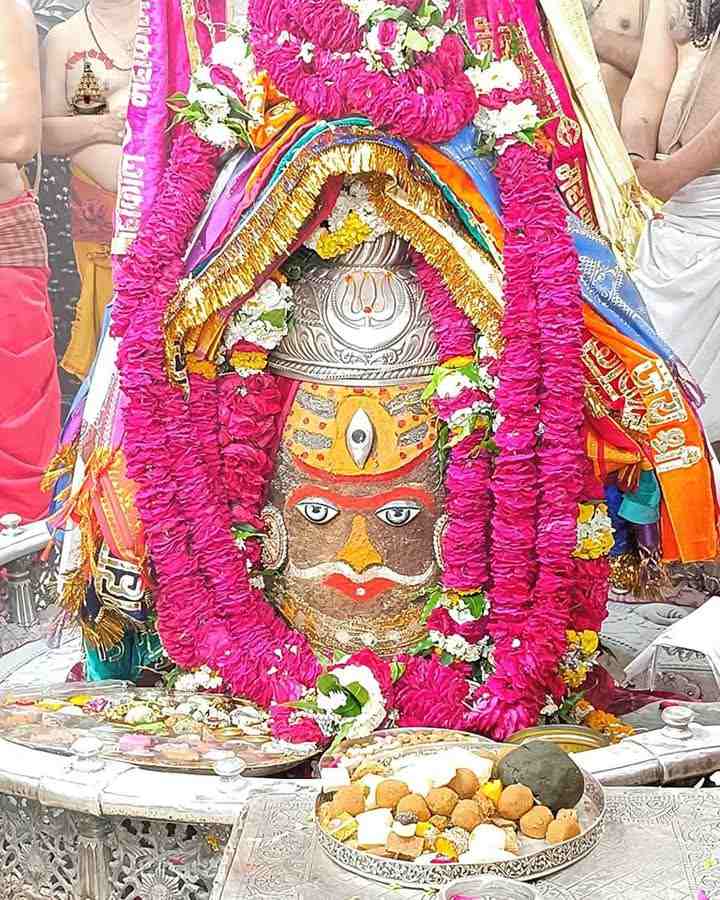श्री महाकालेश्वर को भस्म चढ़ाई गई। साथ ही शेषनाग का रजत मुकुट, रुद्राक्ष की माला के साथ सुगंधित पुष्प से बनी गुलाब के फूलों की माला धारण की। बाबा को फल और मिष्ठान का भोग लगाया गया।