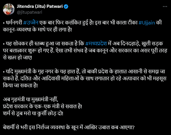 जीतू पटवारी ने आगे कहा कि यदि मुख्यमंत्री के गृह नगर के यह हाल हैं, तो बाकी प्रदेश के हालात आसानी से समझ जा सकते हैं. दलित और आदिवासी महिलाओं के साथ लगातार हो रहे अत्याचार को भी महसूस किया जा सकता है! अब गृहमंत्री या मुख्यमंत्री नहीं, प्रदेश सरकार के एक-एक मंत्री से सवाल है! शर्म से डूब मरो या कुर्सी छोड़ दो! बेशर्मी से भरी इस निर्लज्ज व्यवस्था के खून में आखिर उबाल कब आएगा?’