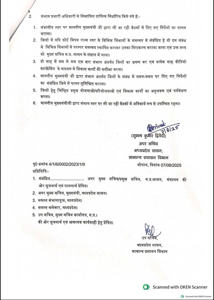 एमपी सरकार ने 8 अपर मुख्य सचिव और 2 प्रमुख सचिव को विभिन्न संभागों में विकास कार्यों की समीक्षा करने की जिम्मेदारी दी है। इन अधिकारियों को संभागीय बैठकों में अनिवार्य रूप से उपस्थित रहना होगा। साथ ही विकास कार्यों की सख्त मॉनिटरिंग करनी होगी।