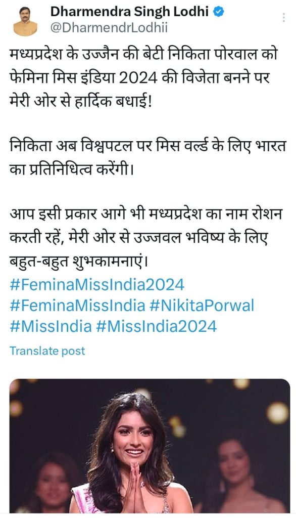 इसी बीच राज्यमंत्री धर्मेंद्र लोधी ने अपने सोशल मीडिया अकाउंट एक्स पर पोस्ट कर निकिता को बधाई दी है। उन्होंने लिखा कि, मध्यप्रदेश के उज्जैन की बेटी निकिता पोरवाल को फेमिना मिस इंडिया 2024 की विजेता बनने पर मेरी ओर से हार्दिक बधाई। निकिता अब विश्वपटल पर मिस वर्ल्ड के लिए भारत का प्रतिनिधित्व करेंगी। आप इसी प्रकार आगे भी मध्यप्रदेश का नाम रोशन करती रहें, मेरी ओर से उज्जवल भविष्य के लिए बहुत-बहुत शुभकामनाएं।
