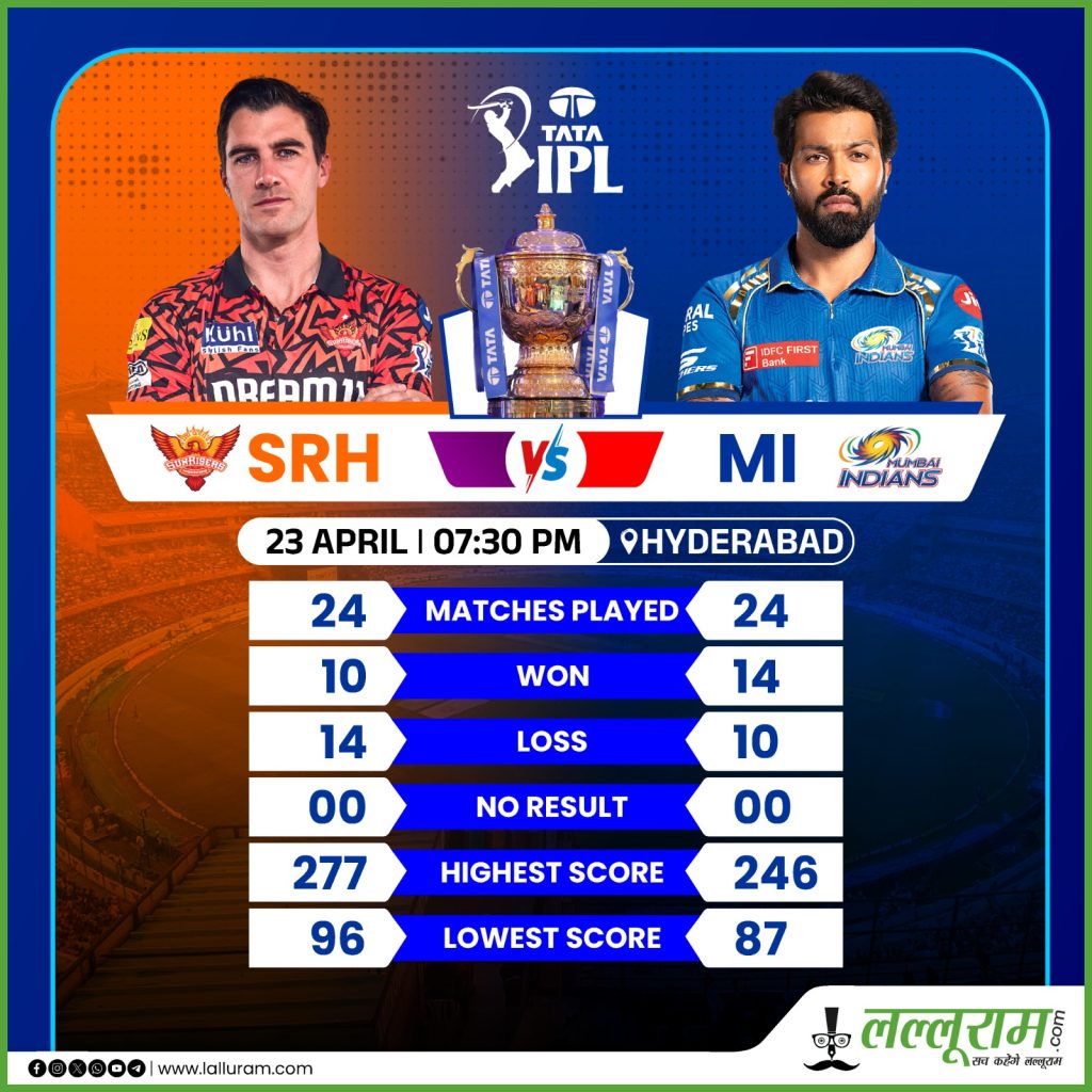 आईपीएल के मौजूदा सीजन में पैट कमिंस की अगुवाई वाली सनराइजर्स हैदराबाद सात में से सिर्फ दो ही मैच जीत सकी है और पॉइंट्स टेबल में 9वें पायदान पर है। जबकि, हार्दिक पांड्या की अगुवाई वाली मुंबई इंडियंस जीत की हैट्रिक के बाद 8 अंकों के साथ छठवें नंबर पर है।