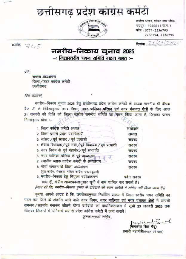 छत्तीसगढ़ कांग्रेस कमेटी के प्रभारी महामंत्री मलकीत सिंह गैंदू की ओर से पार्टी के तमाम जिला और शहर कांग्रेस कमेटी अध्यक्ष को समिति को लेकर पत्र जारी किया गया है.