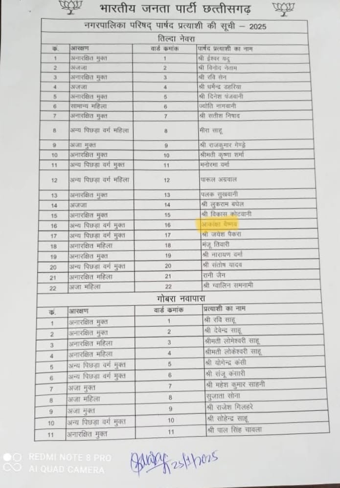 सुरेंद्र जैन, धरसींवा। नामांकन दाखिल करने की अंतिम तिथि के एक दिन पहले भाजपा को एक बड़ा झटका लगा है. भाजपा ने तिल्दा नगर पालिका चुनाव के लिए वार्ड क्रमांक 16 से आकांक्षा वैष्णव को उम्मीदवार बनाया था लेकिन आज उनका नामांकन निरस्त हो गया है. नामांकन रद्द इस कारण हुआ क्योंकि उनकी आयु 21 साल से कम है, जो चुनाव लड़ने के लिए अनिवार्य है. अब भाजपा को आखिरी समय में नया उम्मीदवार चुनने की चुनौती का सामना करना पड़ सकता है.