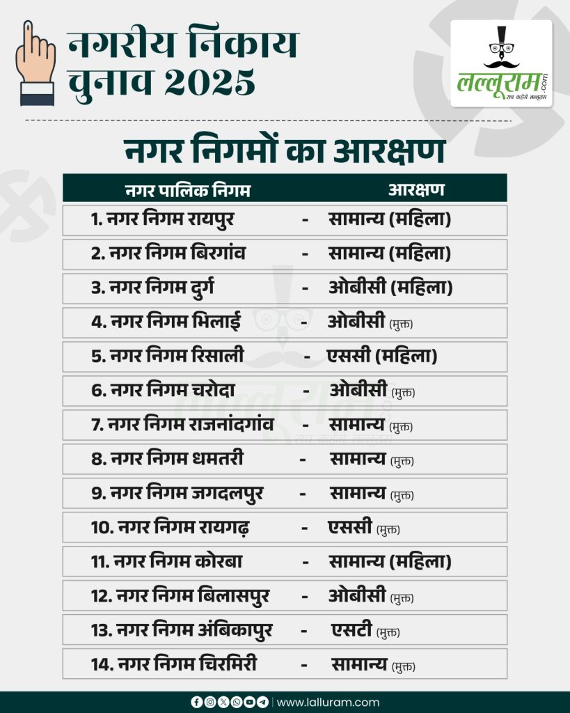 वहीं रायपुर, जगदलपुर, चिरमिरी, बीरगांव सामान्य वर्ग के लिए खुला रखा गया है, सामान्य महिला के लिए रायपुर, कोरबा और बिरगाँव आरक्षित किए गए हैं. इसके अलावा रिसाली और रायगढ़ नगर निगम अनुसूचित जाति के लिए आरक्षित किया गया है. अंबिकापुर नगर निगम अनुसूचित जनजाति के लिए आरक्षित किया गया है.