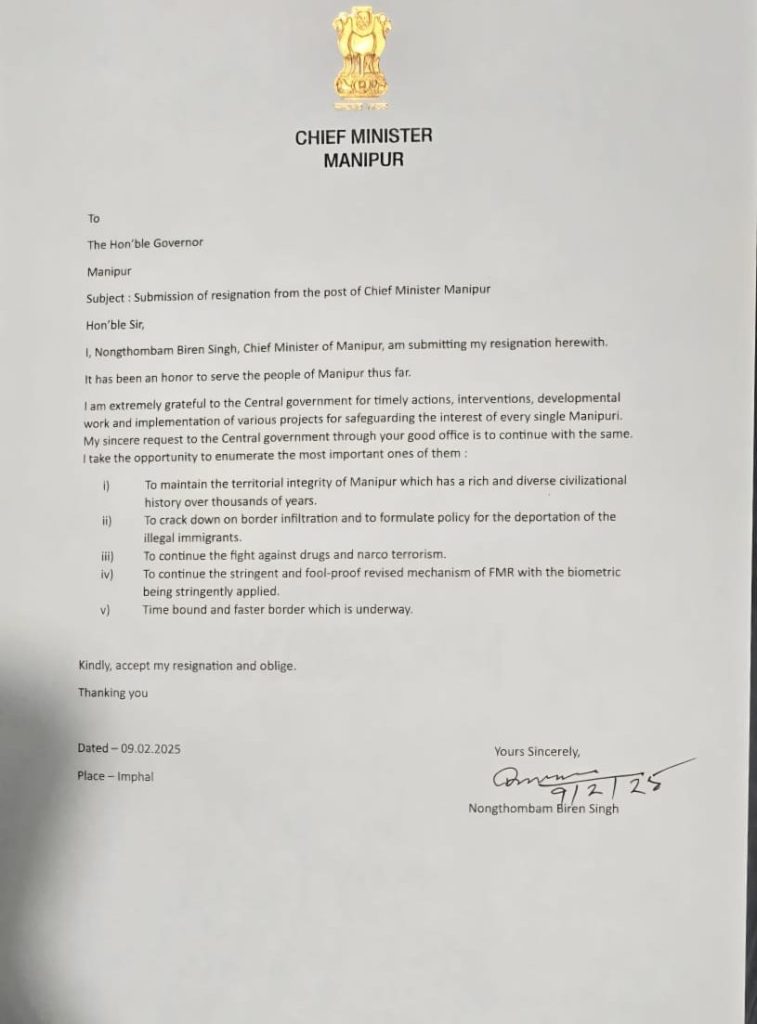 रविवार की शाम मणिपुर के मुख्यमंत्री एन बीरेन सिंह ने इस्तीफा दे दिया। बीरेन सिंह पर राज्य में 21 महीने से जारी हिंसा के चलते काफी दबाव था। विपक्षी पार्टियां भी NDA से लगातार इस मुद्दे पर सवाल पूछ रही थी। सूत्रों के मुताबिक, गवर्नर ने अभी उनसे कार्यवाहक सीएम के तौर पर पद संभालने के लिए कहा था। इस्तीफे से पहले रविवार सुबह एन बीरेन सिंह ने दिल्ली में केंद्रीय गृहमंत्री अमित शाह, भाजपा राष्ट्रीय अध्यक्ष जेपी नड्डा से मुलाकात की थी।