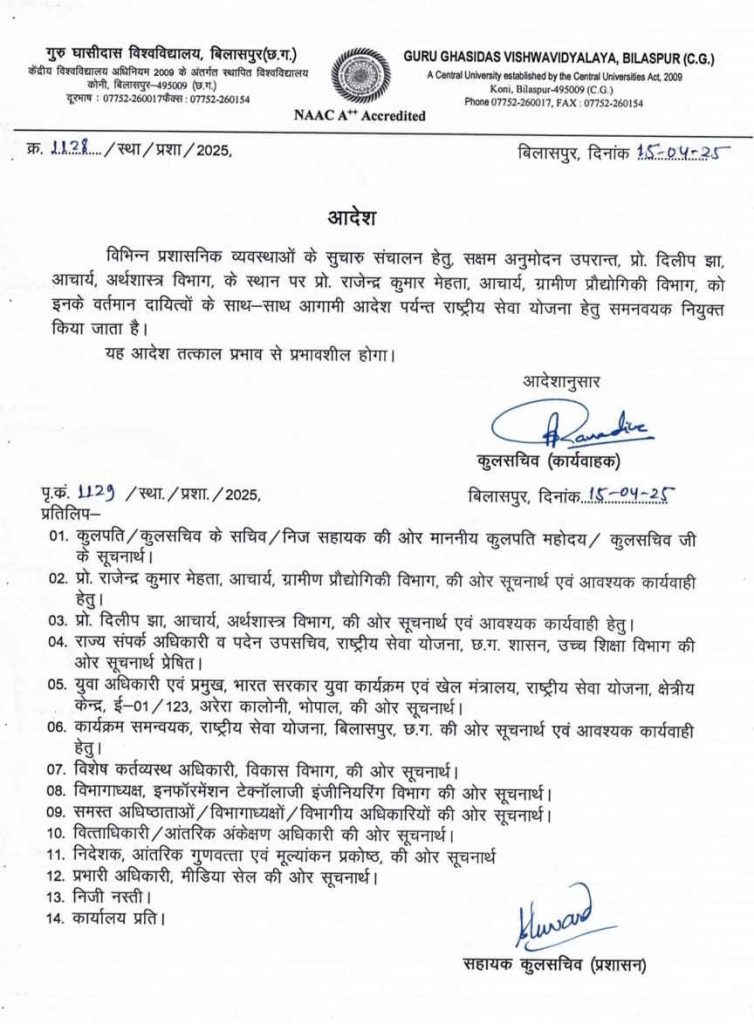 वीरेंद्र गहवई, बिलासपुर। गुरु घासीदास विश्वविद्यालय के एनएसएस शिविर में जबरन नमाज पढ़ाने के मामले कार्रवाई रफ्तार पकड़ने लगी है. एक तरफ पुलिस ने जहां विश्वविद्यालय प्रशासन से छात्रों की शिकायत पर जवाब मांगा है. वहीं दूसरी ओर विश्वविद्यालय प्रशासन ने प्रो. दिलीप झा के खिलाफ कार्रवाई करते हुए उन्हें एनएसएस समन्वयक पद से हटा दिया है. संबंधित खबर : छत्तीसगढ़: NSS कैंप में हिंदू छात्रों से जबरन पढ़ाया गया नमाज, पुलिस में की शिकायत…