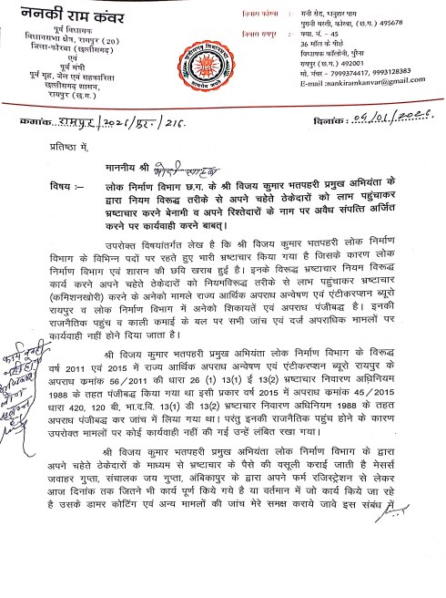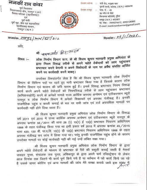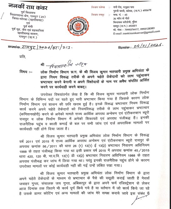 ननकी राम कंवर ने अपने पत्र में आरोप लगाया है कि PWD के मुख्य अभियंता विजय कुमार भतपहरी ने विभिन्न पदों पर रहते हुए अपने चहेते ठेकेदारों को नियमविरुद्ध लाभ पहुंचायाऔर कमिशनखोरी के माध्यम से विभाग एवं शासन की छवि को नुकसान पहुंचाया। उन्होंने बताया कि भतपहरी के खिलाफ 2011 और 2015 में राज्य आर्थिक अपराध अन्वेषण एवं एंटीकरप्शन ब्यूरो रायपुर में अपराध दर्ज किए गए थे, लेकिन राजनीतिक पहुंच और काली कमाई के बल पर सभी जांच और दर्ज आपराधिक मामलों पर कार्रवाई नहीं होने दी गई।