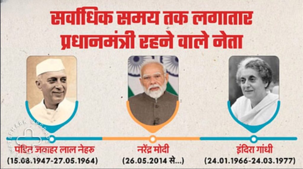 पंडित नेहरू 15 अगस्त 1947 से 27 मई 1964 तक प्रधानमंत्री पद पर रहे थे। वे करीब 16 साल और 9 महीने इस पद पर रहे। इंदिरा गांधी 24 जनवरी 1966 से 24 मार्च 1977 तक प्रधानमंत्री रहीं। उन्होंने 11 साल और 2 महीने लगातार इस पद पर रहकर रिकॉर्ड बनाया था। हालांकि अब प्रधानमंत्री मोदी भी इसी लिस्ट में शामिल हो गए हैं। वे 26 मई 2014 से और अभी तक पीएम के पद पर हैं।