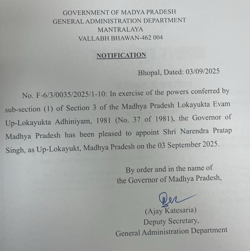 शब्बीर अहमद, भोपाल। नरेंद्र प्रताप सिंह को मध्य प्रदेश का उप लोकायुक्त नियुक्त किया गया है। राज्यपाल मंगू भाई पटेल ने उनकी नियुक्ति की है। मध्य प्रदेश लोकायुक्त, उप-लोकायुक्त अधिनियम की धारा 3 की शक्तियों का प्रयोग करते हुए राज्यपाल ने उन्हें प्रदेश का उप-लोकायुक्त बनाया है।