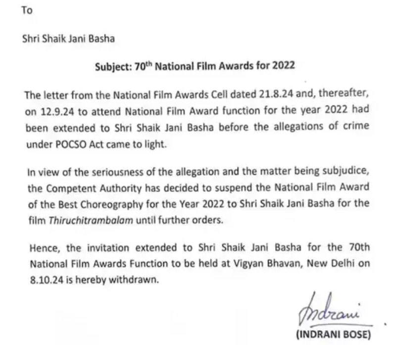 सूचना एवं प्रसारण मंत्रालय ने यौन उत्पीड़न के आरोपों के कारण अब जानी मास्टर के नेशनल अवॉर्ड को निलंबित कर दिया है। उप निदेशक इंद्राणी बोस द्वारा हस्ताक्षरित पत्र में कहा गया है, ‘साल 2022 के राष्ट्रीय फिल्म पुरस्कार समारोह में भाग लेने के लिए श्री शेख जानी बाशा (जानी मास्टर) को POCSO अधिनियम के तहत अपराध के आरोप सामने आने से पहले ही पत्र भेज दिया गया था।