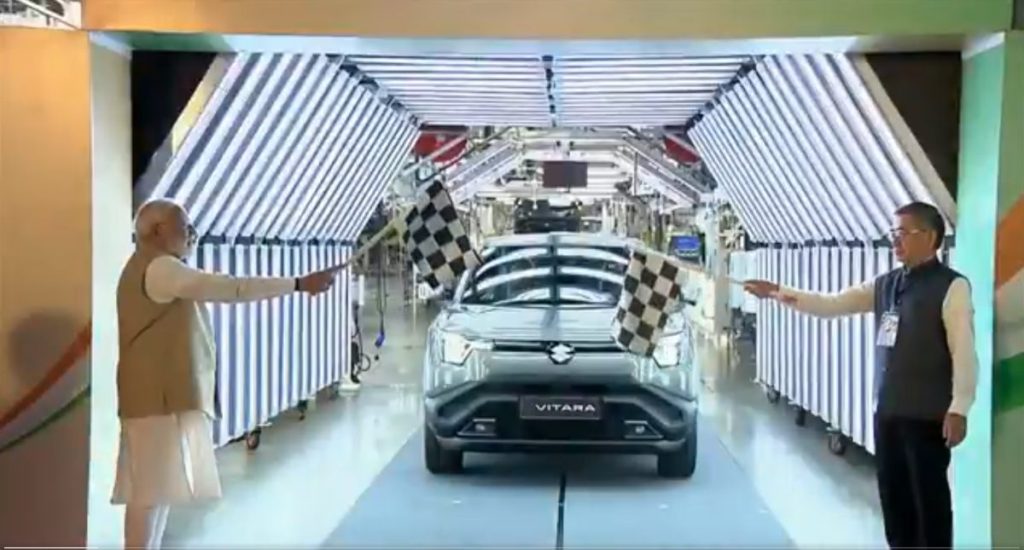 पीएम नरेंद्र मोदी ने आज गुजरात के हंसलपुर में में स्थित सुजुकी मोटर प्लांट (Suzuki Motor Plant) का दौरा किया। इस दौरान प्रधानमंत्री मोदी ने मारुति सुजुकी (Maruti Suzuki) की पहली EV ई-विटारा (E-Vitara) को हरी झंडी दिखाई। इस दौरान पीएम मोदी ने कहा कि दुनिया में अब मेड इन इंडिया लिखी ईवी चलेगी। यह मेक इन इंडिया (make in india) से ‘मेक फॉर द वर्ल्ड’ (Make for the World) की शुरुआत है। उन्होंने कहा कि मारुति अब EV एक्सपोर्ट शुरू कर रही है और दर्जनों गाड़ियां विदेशों में चलेंगी जिन पर लिखा होगा मेक इन इंडिया। पीएम मोदी ने इस प्रोजेक्ट को भारत-जापान दोस्ती का नया आयाम बताया। इस दौरान उन्होंने अगले सप्ताह अपनी जापान यात्रा का भी ऐलान किया।