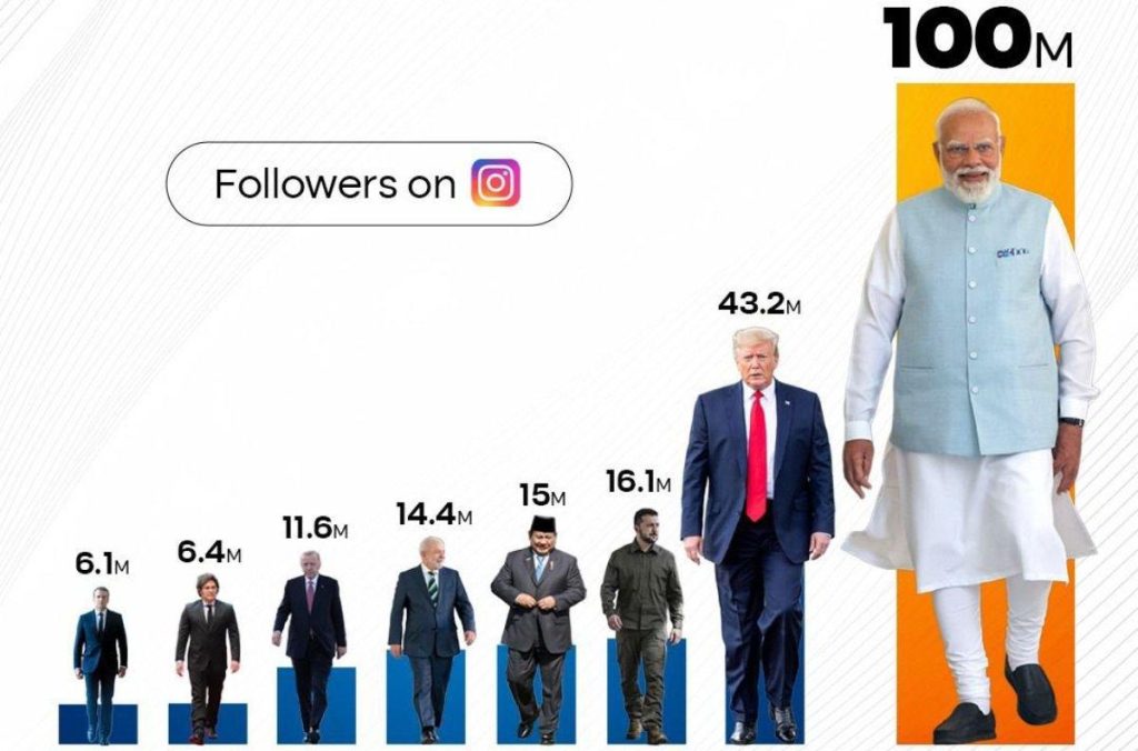 . पीएम मोदी इंस्टाग्राम पर 100 मिलियन फॉलोअर्स का आंकड़ा पार करने वाले दुनिया के पहले ग्लोबल लीडर बन गए हैं. उनके आसपास दुनिया का कोई भी नेता नहीं है. प्रधानमंत्री मोदी ने पूरी दुनिया के लीडर्स को पछाड़ते हुए एक नया रिकॉर्ड बनाया है। अमेरिकी राष्ट्रपति डोनाल्ड ट्रंप दूसरे नंबर पर हैं। पीएम मोदी के सोशल मीडिया प्लेटफॉर्म इंस्टाग्राम (Instagram) पर 100 मिलियन यानी 10 करोड़ से ज्यादा फॉलोअर्स हो गए हैं।