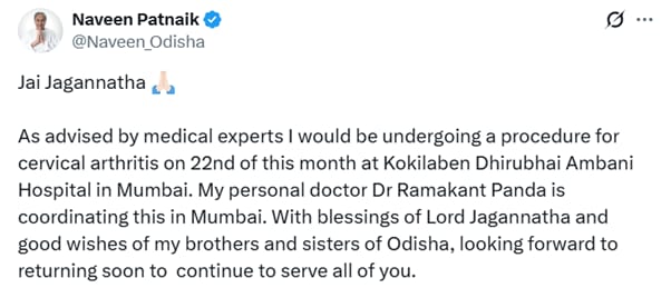 प्रभु जगन्नाथ के आशीर्वाद और ओडिशा के मेरे भाइयों और बहनों की शुभकामनाओं के साथ, आप सभी की सेवा जारी रखने के लिए जल्द ही लौटने की उम्मीद कर रहा हूं,” पटनायक ने एक्स पर पोस्ट किया।