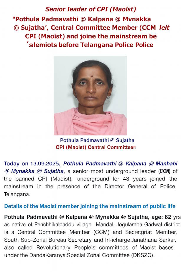 तेलंगाना पुलिस महानिदेशक की मौजूदगी में आत्मसमर्पण करने वाली सुजाता तेलंगाना के जोगुलम्बा गडवाल जिले के पेंचिकाल्पाडु गांव की निवासी है. सुजाता अब मुख्यधारा में शामिल होकर समाज में योगदान देने की इच्छा जताई है, पुलिस का मानना है कि सुजाता का आत्मसमर्पण संगठन के लिए बड़ा झटका है.