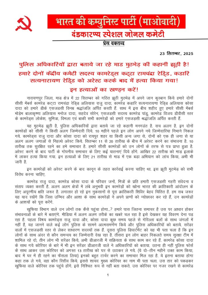 CG News : आशुतोष तिवारी, जगदलपुर. नारायणपुर के अबूझमाड़ जंगल में 22 सितंबर को हुई मुठभेड़ को लेकर नक्सलियों ने गंभीर आरोप लगाए हैं. माओवादी संगठन के दंडकारण्य स्पेशल जोनल कमेटी के विकल्प की ओर से जारी पर्चे में कहा गया है कि यह मुठभेड़ फर्जी है और उनके दो सेंट्रल कमेटी सदस्य कट्टा रामचंद्र रेड्डी उर्फ राजू दादा और कडरी सत्यनारायण रेड्डी उर्फ कोसा दादा की हत्या गिरफ्तारी के बाद की गई.