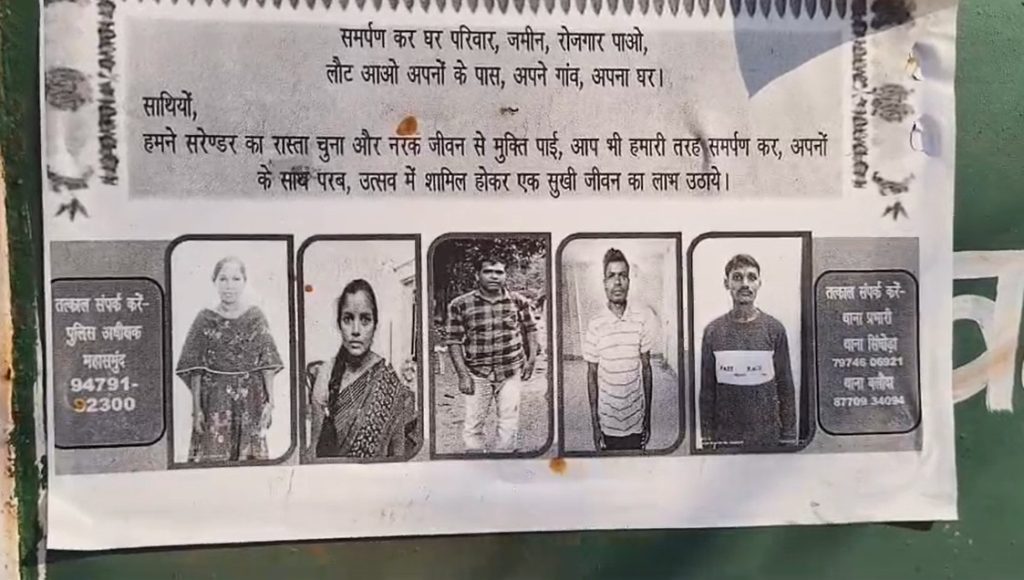 महासमुंद पुलिस और ओडिशा पुलिस ने अपील के पोस्टर जारी कर नक्सलियों से आत्मसमर्पण की अपील की है. जिसमें मुख्य धारा में लौट चुके नक्सलियों की तस्वीर भी किया गया है. चस्पा किए गए पोस्टर में उनके संपर्क में रहे माओवादियों के अलावा जिला पुलिस का भी नबंर जारी किया गया है. महासमुंद पुलिस लाइन में सरेंडर को लेकर प्रेसवार्ता की तैयारी हो रही है.