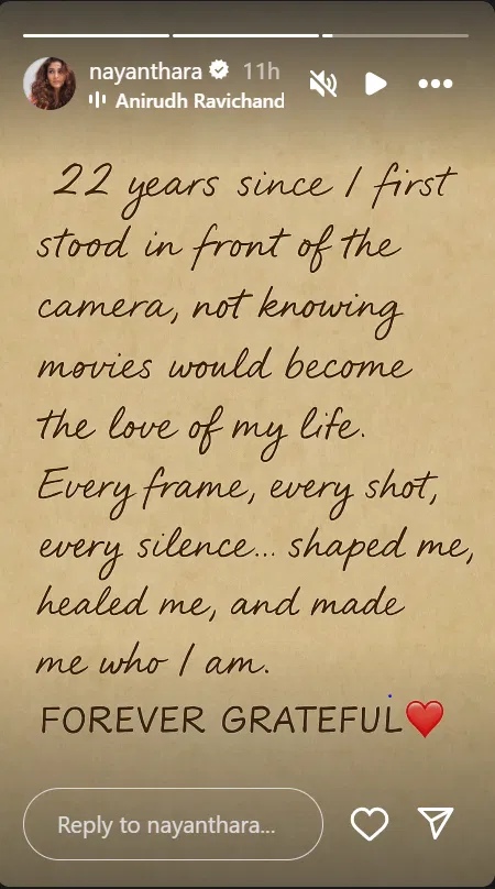 बता दें कि नयनतारा (Nayanthara) ने अपने इंस्टाग्राम की स्टोरी पर एक फोटो शेयर किया है. इस फोटो के साथ एक्ट्रेस ने एक नोट में लिखा, ‘22 साल हो गए जब मैं पहली बार कैमरे के सामने खड़ी हुई थी, तब मुझे नहीं पता था कि फिल्में मेरे जीवन का प्यार बन जाएंगी. हर शॉट, हर फ्रेम, हर खामोशी, ने मुझे आकार दिया, मुझे ठीक किया और मुझे वह बनाया जो मैं हूं. हमेशा आभारी रहूंगी.’
