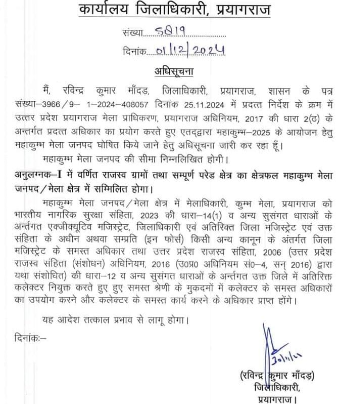 रविवार देर रात इसकी घोषणा की गई. 76वां जनपद में चार तहसील और 67 गांव को मिलाकर बनाया गया है. प्रयागराज के डीएम रविंद्र कुमार मांदड़ ने इसका आदेश जारी कर दिया है. महाकुंभ मेला जनपद में कुल 4 तहसील शामिल किए गए हैं, जो पहले प्रयागराज जनपद में थे. इसमें सदर, सोरांव, फूलपुर और करछना तहसील शामिल है.