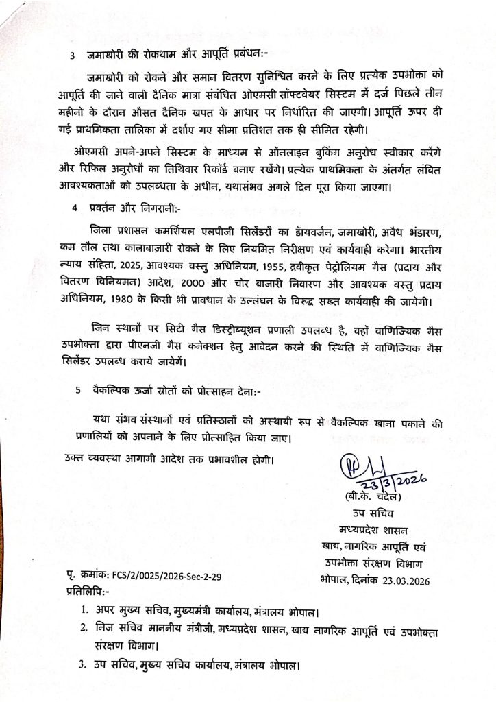 शब्बीर अहमद, भोपाल। देश भर में गैस संकट की वजह से मध्य प्रदेश में कमर्शियल एलपीजी आवंटन को लेकर नई गाइडलाइन जारी हो गई है। इसमें अलग-अलग सेक्टर के लिए कोटा निर्धारित कर दिया गया है। शैक्षणिक संस्थान और चिकित्सा को प्राथमिकता दी गई है।