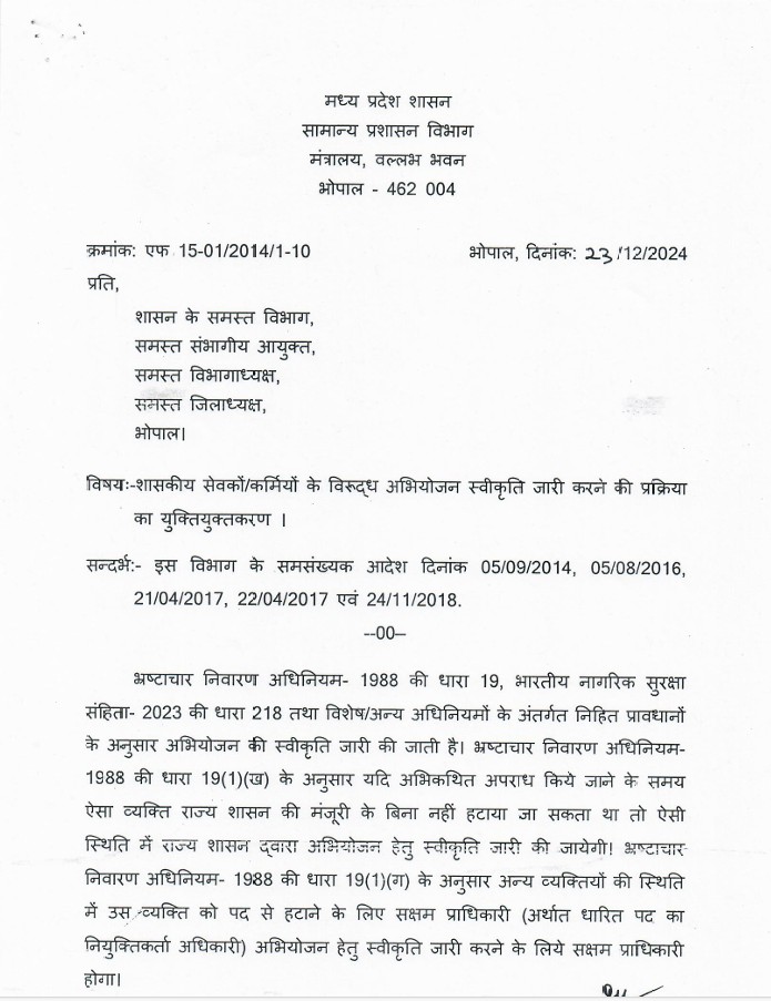 सामान्य प्रशासन विभाग ने कहा कि अभियोजन की स्वीकृति तभी मिलेगी जब कर्मचारियों को एक बार सुनने का मौका दिया जाएगा। उसकी बात सुने बगैर आयोजन की स्वीकृति नहीं दी जा सकेगी। ऐसे मामलों में 3 महीने के भीतर निराकरण करना होगा। केस डायरी स्टडी करने के बाद ही अभियोजन की स्वीकृति मिलेगी। इसके तहत विभाग के बजाय संबंधित विभाग के अधिकारी के पास अभियोजन की स्वीकृति के लिए डायरी भेजी जाएगी।