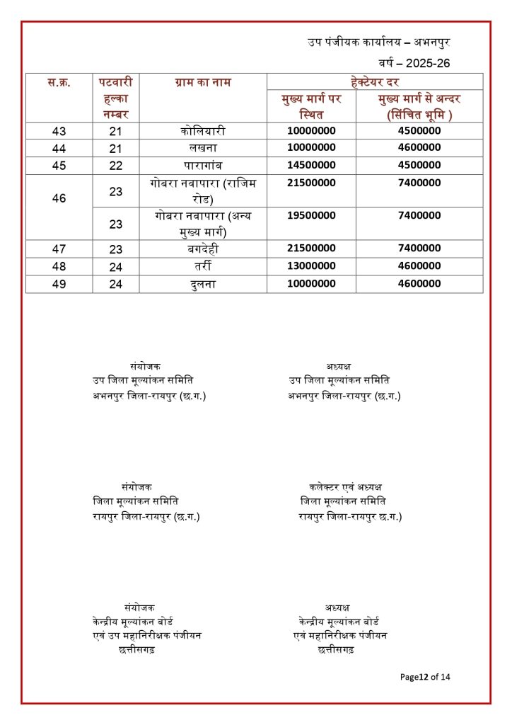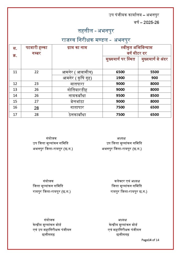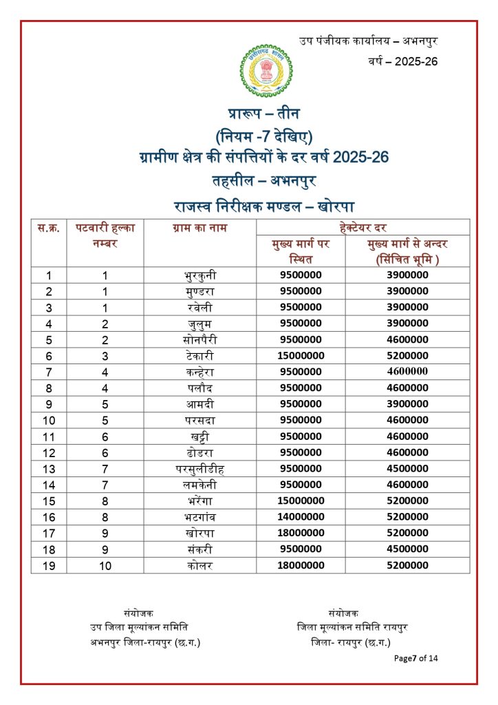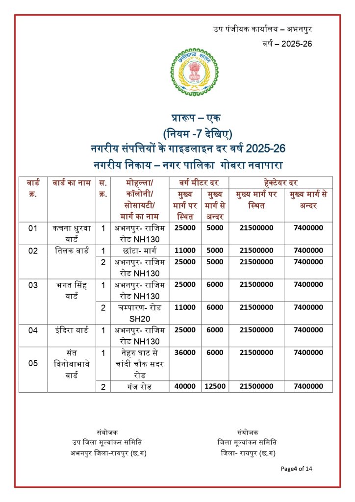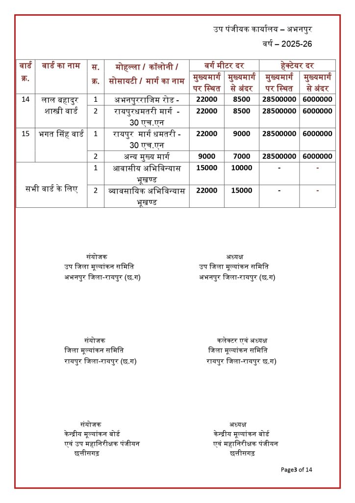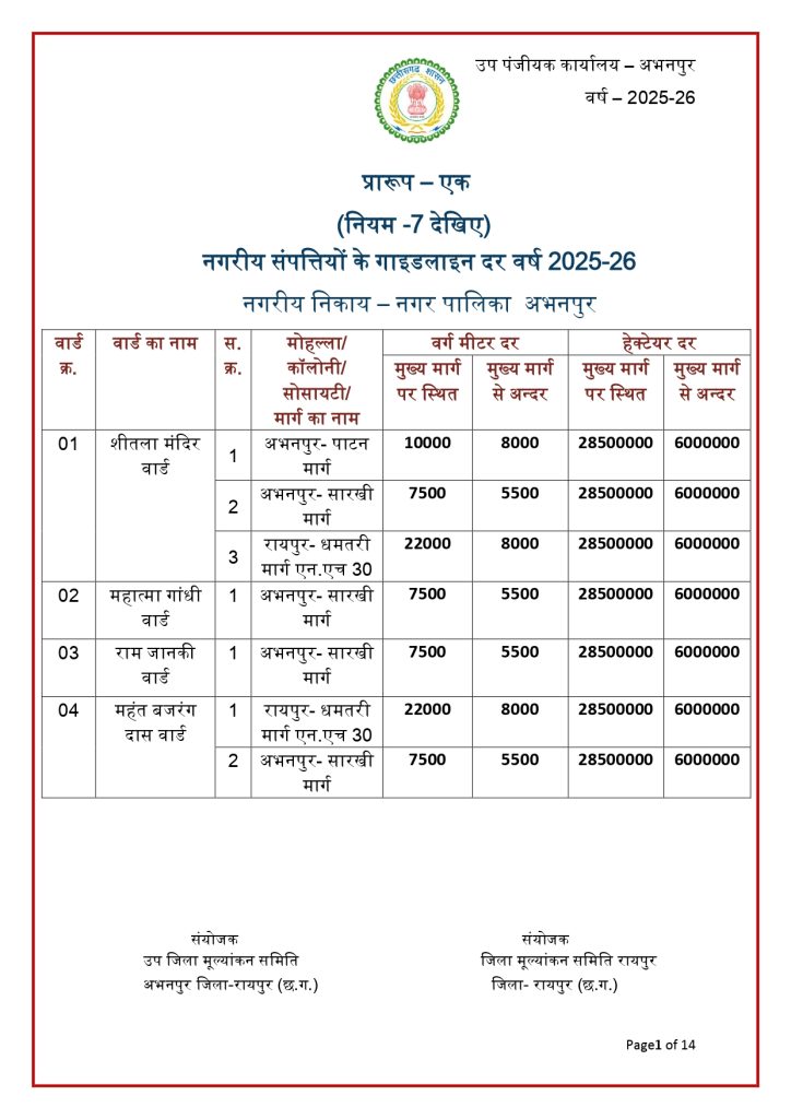 रायपुर। छत्तीसगढ़ में जमीन की नई संशोधित गाइडलाइन दर जारी हो गई है. राज्य की जिला मूल्यांकन समितियों से प्राप्त प्रस्तावों के आधार पर जमीन की नई गाइडलाइन दरों को मंजूरी देने के साथ प्रकाशित कर दिया गया है. नई गाइडलाइन में शहरी के मुकबाले ग्रामीण क्षेत्रों की दर में भारी कमी आई है. नई संशोधित गाइडलाइन दरें 30 जनवरी 2026 से प्रभावशील हो गई हैं.