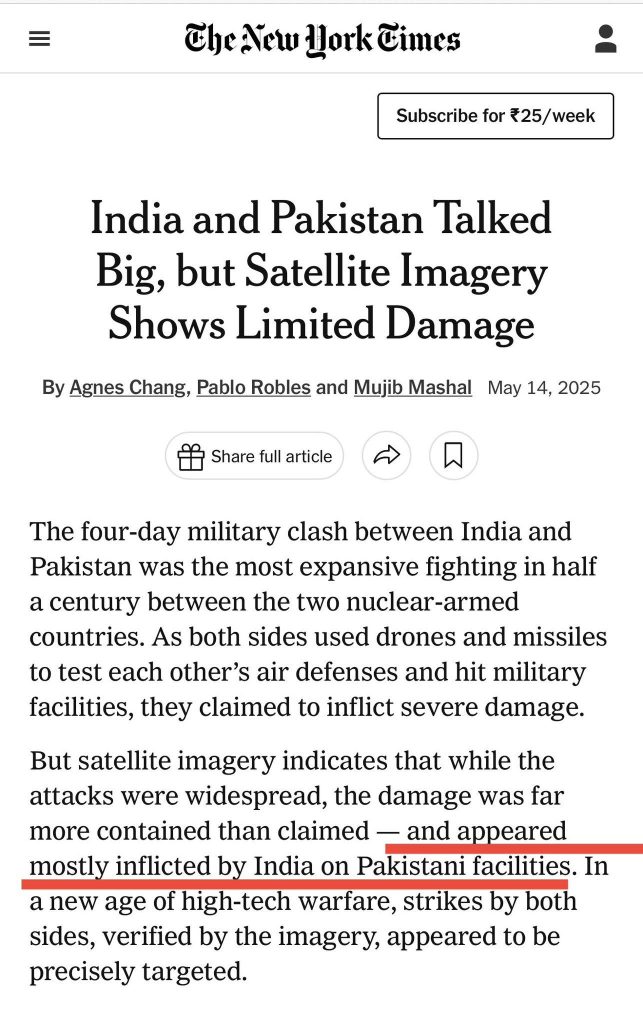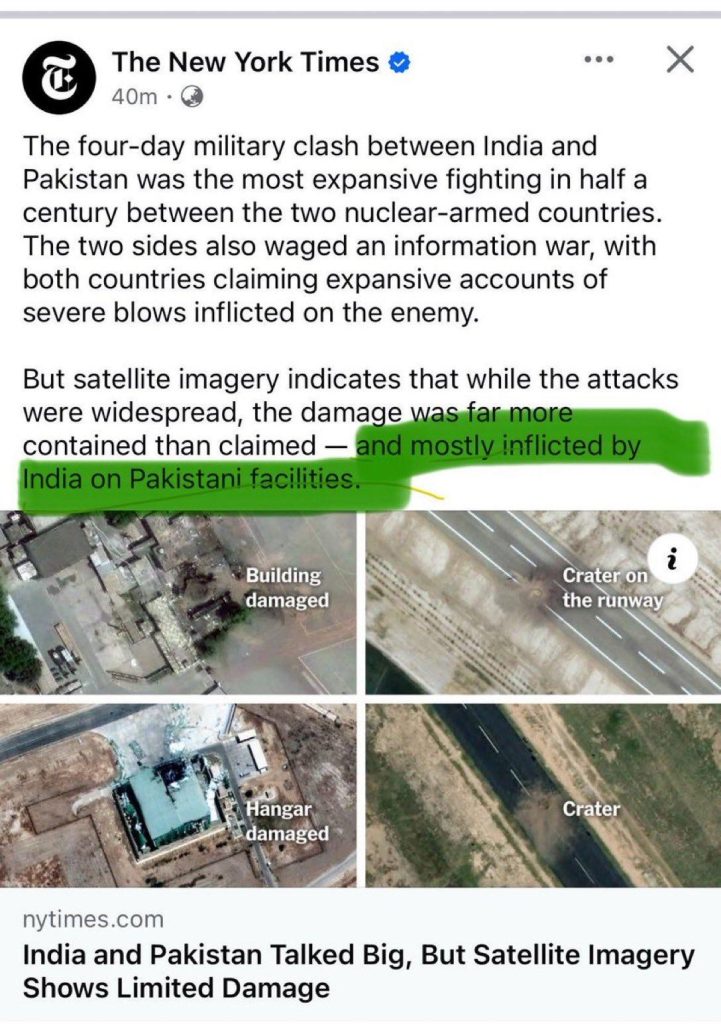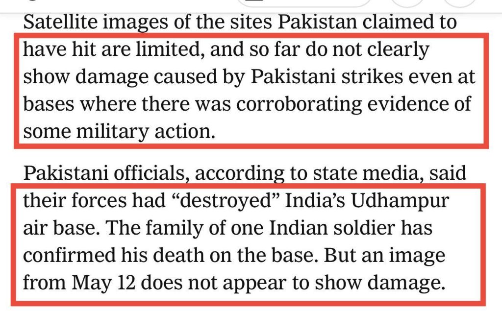 न्यूयॉर्क टाइम्स ने लिखा है कि सैटेलाइट तस्वीरों से साफ़ पता चलता है कि भले ही दोनों पक्षों ने एक-दूसरे पर गंभीर नुकसान पहुंचाने का दावा किया, लेकिन असली और प्रमुख नुकसान भारत द्वारा पाकिस्तान को ही पहुंचाया गया है। रिपोर्ट में कहा गया है कि आधुनिक युद्ध प्रणाली और सटीक हथियारों के इस युग में दोनों देशों ने अपने हमलों को रणनीतिक रूप से अंजाम दिया, लेकिन भारत ने खासतौर पर पाकिस्तान की वायुसेना की क्षमताओं और एयरफील्ड्स को निशाना बनाया।