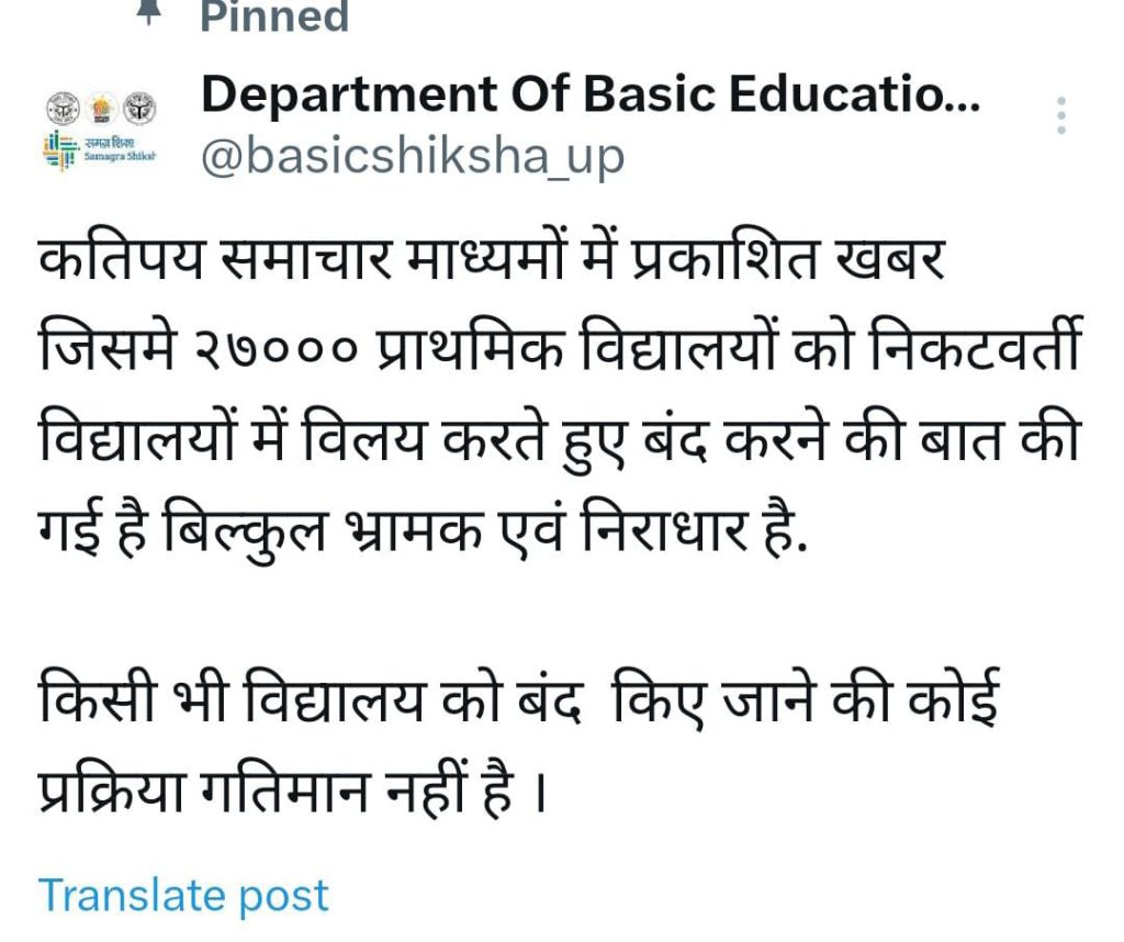 यूपी में कोई भी स्कूल बंद नहीं होंगे. यूपी के 27000 से ज्यादा बेसिक शिक्षा परिषद के स्कूल बंद होने की खबर झूठी निकली है. विभाग की ओर से आधिकारिक ट्विटर हैंडल पर दो दिनों से चल रही स्कूल बंद होने की खबर का खंडन किया गया है. इसकी पुष्टी महानिदेशक स्कूल शिक्षा कंचन वर्मा ने की है.
