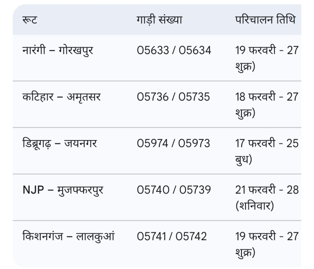 ​ये विशेष ट्रेनें 17 फरवरी 2026 से शुरू होकर मार्च के अंत तक अपनी सेवाएं देंगी। यात्री अपनी टिकटों की बुकिंग IRCTC की वेबसाइट या रेलवे काउंटर से करा सकते हैं। इन ट्रेनों के चलने से न केवल सीट की उपलब्धता बढ़ेगी, बल्कि यात्रियों का सफर भी आरामदायक होगा।
