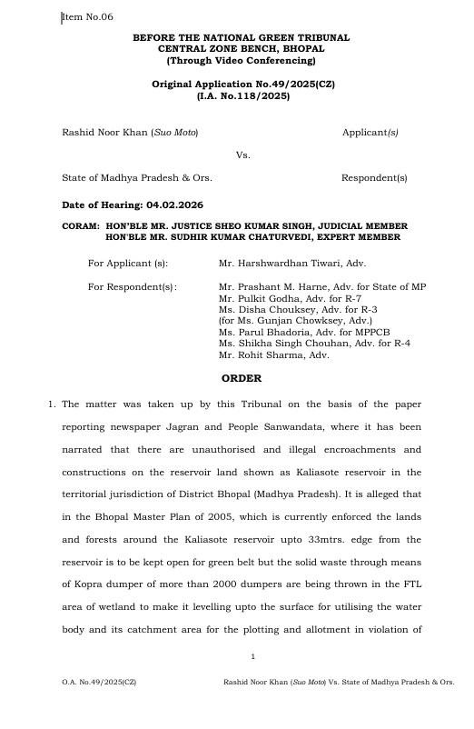 शिखिल ब्यौहार, भोपाल। NGT ने राजधानी के कलियासोत और केरवा डैम क्षेत्र में अवैध मिट्टी भराव और ठोस अपशिष्ट डंपिंग के गंभीर मामले में अहम आदेश पारित किया है। यह कार्रवाई याचिकाकर्ता रशीद नूर खान की याचिका पर की थी..इसमें बताया गया था कि भोपाल के महुआखेड़ा क्षेत्र में स्थित केरवा डैम, जो कलियासोत का हिस्सा है, उसके फुल टैंक लेवल (FTL) और आसपास के क्षेत्र में 2000 से अधिक डंपरों के माध्यम से कोपरा, मुर्रम एवं काली मिट्टी डाली गई। इस भराव का उद्देश्य जलाशय और उसके कैचमेंट क्षेत्र को समतल कर भविष्य में प्लॉटिंग और निर्माण गतिविधियाँ करना बताया गया। यह गतिविधियां वेटलैंड (संरक्षण एवं प्रबंधन) नियम, 2017, पर्यावरण संरक्षण अधिनियम, 1986 तथा जल (प्रदूषण निवारण एवं नियंत्रण) अधिनियम, 1974 के प्रत्यक्ष उल्लंघन के रूप में सामने आईं।