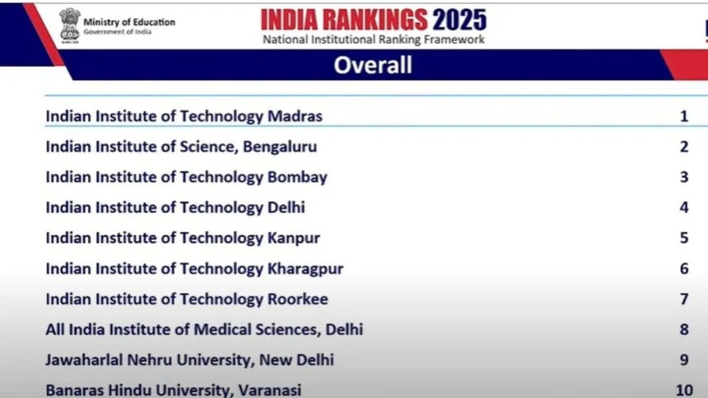 NIRF 2025: ओवऑल कैटेगरी: आईआईटी-मद्रास, आईआईएससी बैंगलोर और आईआईटी-बॉम्बे शीर्ष 3