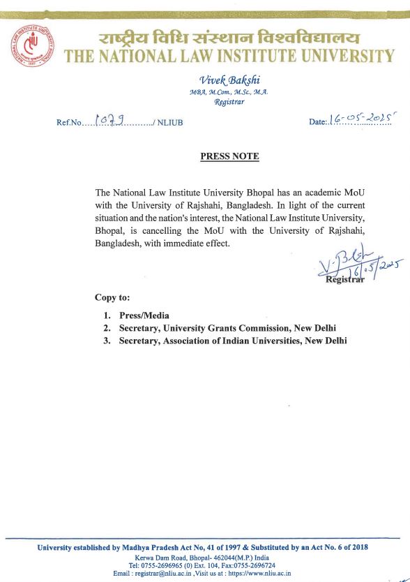 NLIU ने एक प्रेस नोट जारी कर कहा- नेशनल लॉ इंस्टीट्यूट यूनिवर्सिटी भोपाल ने बांग्लादेश के राजशाही विश्वविद्यालय के साथ एक शैक्षणिक समझौता ज्ञापन पर हस्ताक्षर किए हैं। वर्तमान स्थिति और राष्ट्र के हित को देखते हुए, एनएलआईयू, भोपाल बांग्लादेश के राजशाही विश्वविद्यालय के साथ किए गए समझौता ज्ञापन को तत्काल प्रभाव से रद्द कर रहा है।