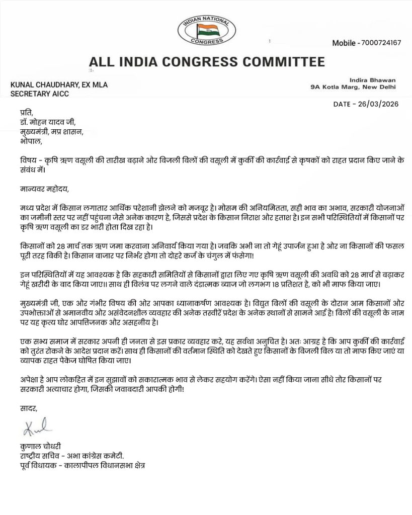 शिखिल ब्यौहार, भोपाल। मध्यप्रदेश में फसल खरीदी नहीं हुई और किसानों से कर्ज वसूली की तैयारी पूरी कर ली है। सोसाइटी से लिया कर्ज जमा करने की कल अंतिम तारीख है। मामले में कांग्रेस के राष्ट्रीय सचिव कुणाल चौधरी ने सीएम डॉ मोहन यादव को पत्र लिखकर कर्ज चुकाने की तारीख बढ़ाने की मांग करते हुए आंदोलन की चेतावनी दी है।