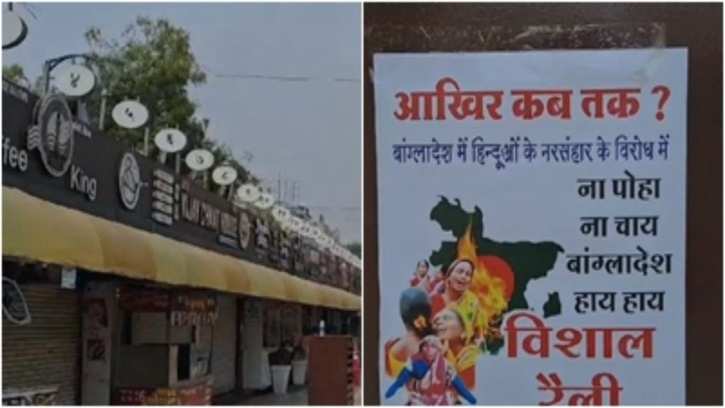 हेमंत शर्मा, इंदौर। बांग्लादेश में हिंदू समुदाय पर हो रही हिंसा के विरोध में इंदौर के 56 दुकान क्षेत्र में व्यापारियों ने बुधवार को अपनी दुकानें बंद रखीं। चाय और पोहा की बिक्री रोकते हुए दुकानदारों ने “ना पोहा, ना चाय, बांग्लादेश हाय हाय” जैसे नारों वाले पोस्टर लगाए। प्रदर्शन के दौरान व्यापारियों ने बांग्लादेश में हिंदू समुदाय पर हो रहे अत्याचारों की निंदा की।
