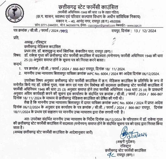 सत्यपाल सिंह राजपूत, रायपुर। छत्तीसगढ़ स्टेट फार्मेसी काउंसिल रजिस्ट्रार द्वारा मनोनीत सदस्य डॉ. राकेश गुप्ता की बर्खास्तगी को गलत बताते हुए हाई कोर्ट ने निरस्त कर दिया है. हाई कोर्ट के आदेश के बाद जिन रजिस्ट्रार ने बर्खास्तगी आदेश जारी किया था, उन्होंने ने ही बहाली का भी आदेश जारी किया. यह भी पढ़ें : छत्तीसगढ़ सशस्त्र बल के आरक्षक की बर्खास्तगी को हाई कोर्ट ने किया खारिज, सेवा में बहाली का दिया आदेश