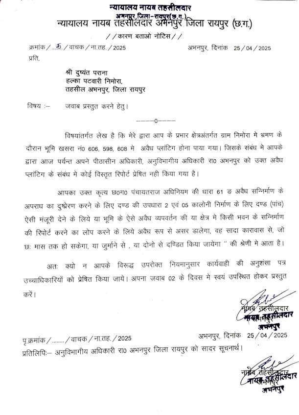 रायपुर। अभनपुर नायब तहसीलदार ने अवैध प्लांटिग के संबंध में एसडीएम को विस्तृत रिपोर्ट पेश नहीं करने पर निमोरा हल्का पटवारी दुष्यंत पराना को कारण बताओ नोटिस जारी किया है. नोटिस में दो दिनों के भीतर खुद प्रस्तुत होकर जवाब देने को कहा गया है.