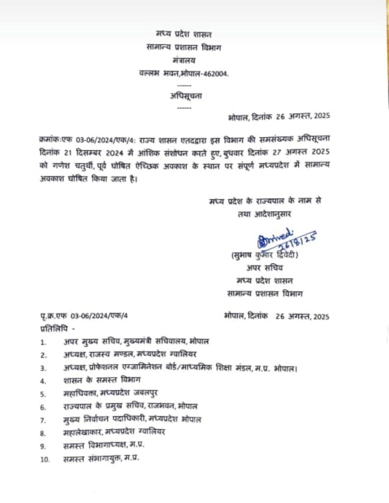 मंगलवार को मोहन कैबिनेट ने बड़ा फैसला लिया। एमपी सरकार ने गणेश चतुर्थी पर छुट्टी का ऐलान किया था। जिसे लेकर अधिसूचना जारी कर दी गई है। नोटिफिकेशन में लिखा- राज्य शासन एतदद्वारा इस विभाग की समसंख्यक अधिसूचना दिनांक 21 दिसंबर 2024 में आंशिक संशोधन करते हुए, बुधवार दिनांक 27 अगस्त 2025 को गणेश चतुर्थी, पूर्व घोषित ऐच्छिक अवकाश के स्थान पर संपूर्ण मध्य प्रदेश में सामान्य अवकाश घोषित किया जाता है।