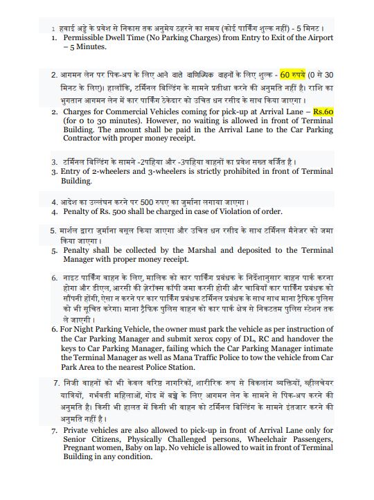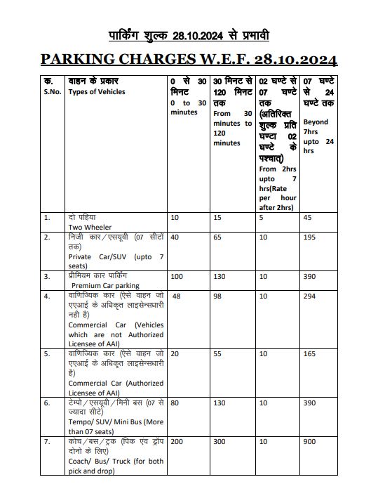 नए नियमों के अनुसार, प्रीमियम कारों के लिए पार्किंग शुल्क 100 रुपए, और टेंपो, SUV तथा मिनी बस के लिए 80 रुपए निर्धारित किया गया है. फ्री पिकअप और ड्रॉप के लिए यात्रियों को अब केवल 5 मिनट का समय मिलेगा.