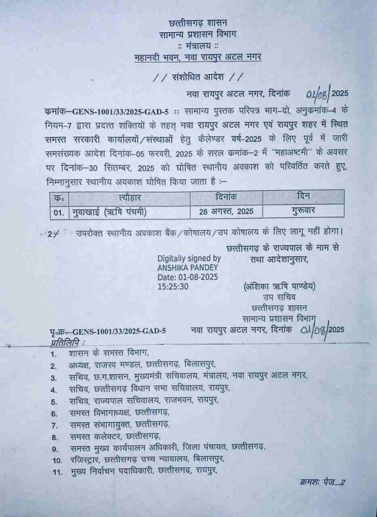 महाअष्टमी का अवकाश निरस्त कर दिया गया है और उसके बदले नुआखाई को स्थानीय अवकाश घोषित कर दिया गया है. इस दिन नवा रायपुर अटल नगर एवं रायपुर शहर में स्थित सभी सरकारी कार्यालयों/संस्थाओं में छुट्टी रहेगी. यह स्थानीय अवकाश बैंक/कोषालय/उप कोषालय के लिए लागू नहीं होगा.